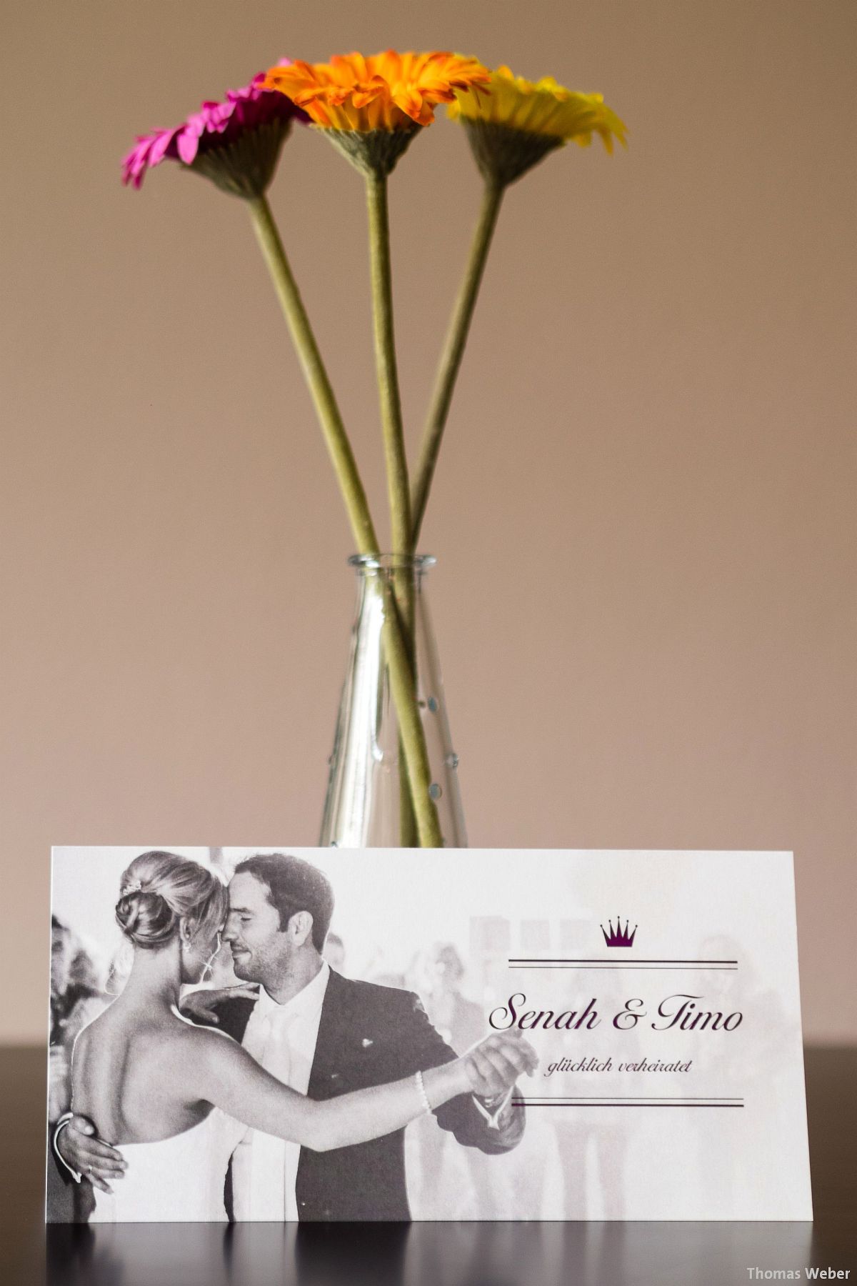 Andererseits bieten sie sehr hochwertige Einladungs- und Danksagungskarten an, die sich vom weit verbreiteten „Postkartenformat in Hochglanz“ abheben. Einige Beispiele habe ich hier mal fotografiert, Yvonne und Klaas waren so lieb und haben mir ein paar Muster mit „meinen“ Hochzeitspaaren angefertigt.
